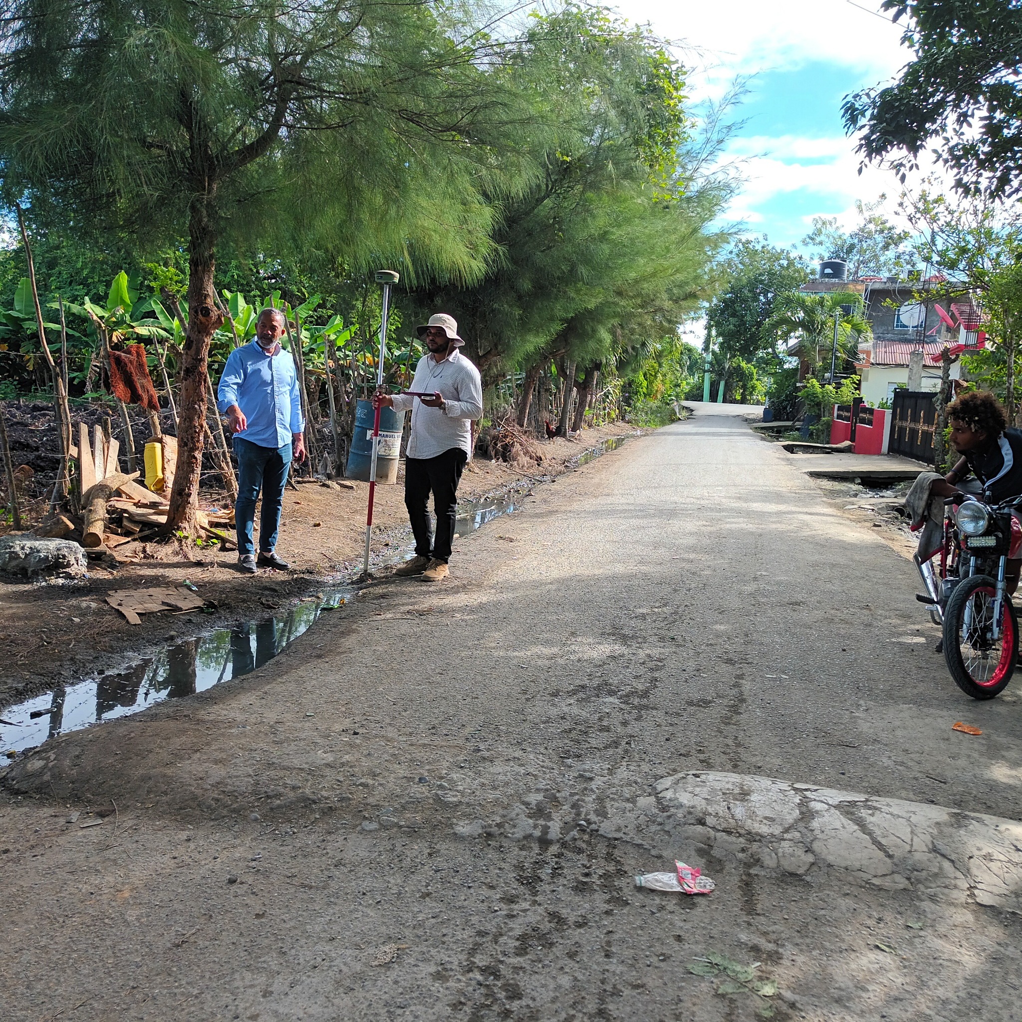 El ingeniero Rigoberto Alcántara, en compañía del técnico del área de topografía, realizó un levantamiento técnico en la curva de la pendiente ubicada en la entrada del sector Don Lolo, con el objetivo de identificar y tomar los puntos más relevantes para el diseño y correcta canalización de las aguas pluviales en dicha zona.